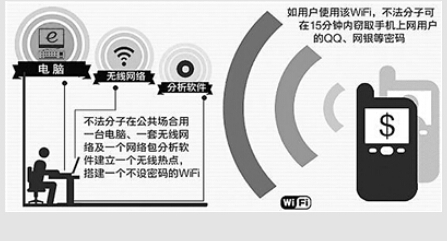 随着我国公共场所免费WiFi的不断增多,蹭个网、转个账、淘个宝等,成为不少网民的习惯动作。然而,由于免费WiFi存在路由器和网络漏洞,往往成为黑客攻击的对象。据腾讯移动安全实验室工程师陈湘玲介绍,在公共场所接入免费WiFi的安全风险包括:用户的社交软件账号、密码被劫持和恶意利用;手机或电脑中的文件及照片等个人信息泄露;用户网银和支付宝等移动支付的资金被盗刷等。艾媒咨询CEO张毅说,餐饮店、酒店、咖啡厅等商家是WiFi的高风险区。“一根网线加一台无线路由器组成的免费WiFi,往往‘后门’大开,没有安全防范设置,为黑客打开了方便之门。”