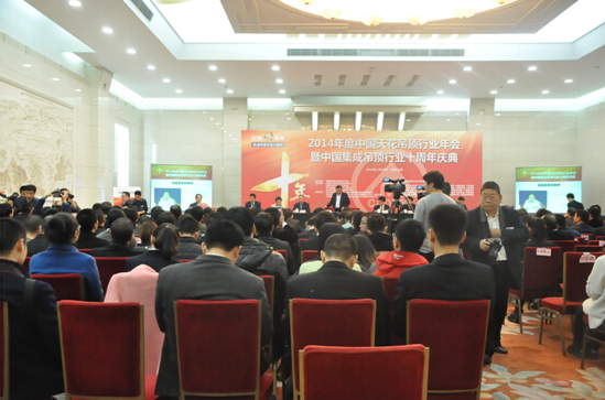 2014年12月20日上午,由中国建筑装饰装修材料协会主办的“2014年天花吊顶年会暨中国集成吊顶行业十周年庆典”,在人民大会堂河南厅隆重召开。来自天花吊顶行业的浙江友邦集成吊顶、奥普集团等百余家优秀企业的代表,以及来自中国建筑装饰装修材料行业的诸多专家等嘉宾共聚一堂,对2014年天花吊顶行业十年来的整体发展进行了总结,并围绕天花吊顶行业的现状与未来发展趋势等问题进行了深刻探讨。