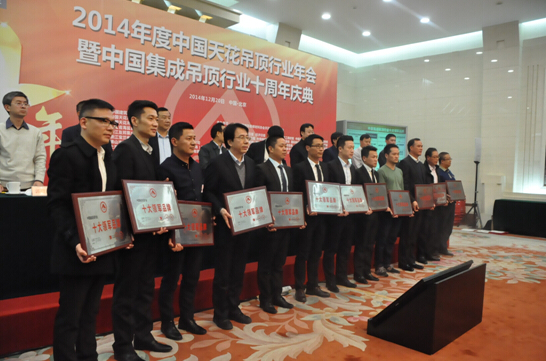 此次表彰的奖项十分多样化,集中展现天花吊顶行业的优秀成果。浙江友邦、杭州奥普、法师龙、美尔凯特、巴迪斯、蓝姆特、容声、品格、奥华、宝兰、今顶、保丽卡莱等获得了“中国集成吊顶行业十大领军品牌”的称号,展现领军风采。浙江昆仑电气有限公司、嘉兴奇力电器有限公司浙江顶善美集成吊顶有限公司 、嘉兴格勒集成吊顶科技有限公司、海盐美赫电器科技有限公司 、浙江豪门塑业有限公司 、浙江华夏杰高分子建材有限公司等获得了“中国天花吊顶行业产品创新奖”,引领行业创新风潮。浙江友邦集成吊顶股份有限公司、广东容声电器股份有限公司、杭州奥普卫厨科技有限公司、佛山市巴迪斯新型建材有限公司获得了“中国集成吊顶行业‘顶天艺术’大奖”,彰显行业美学尖端。同时颁布的吊顶行业十佳新锐品牌、吊顶行业优秀经销商、天花吊顶行业制定供应商,同样成为瞩目焦点。浙江友邦集成吊顶股份有限公司总经理王吴良,佛山市泰铝铝业有限公司总经理欧海峰,被评为“2014中国集成吊顶行业年度风云人物”,展现出吊顶人的精英风采。浙江友邦集成吊顶股份有限公司董事长时沈祥,更是凭借对中国集成吊顶行业的杰出贡献,被授予中国集成吊顶行业终身成就奖,成为年会上最令人尊敬和瞩目的耀眼明星。