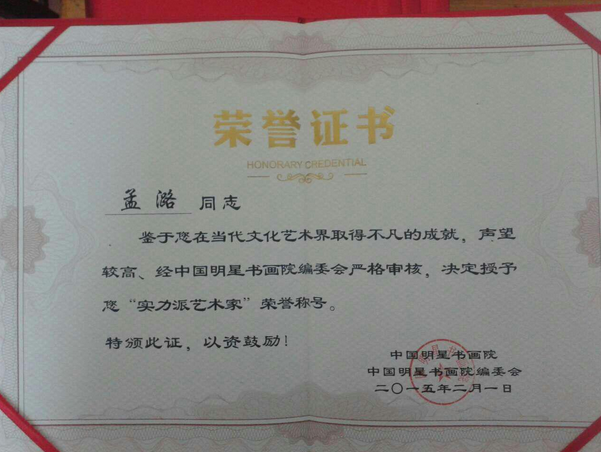 孟潞被中国明星书画院编委会授予“实力派艺术家”