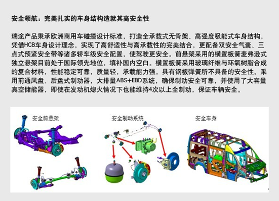 在安全性的打造上,黄海瑞途更是下足了功夫。黄海瑞途外部设计按照欧洲商用车碰撞设计标准,全承载无骨架、高强度吸能式车身结构;内部设计采用前通风盘、后盘式制动器,大排量ABS+EBD系统,确保制动安全可靠,并使用了大容量真空储能器,配备双安全气囊、三点式预紧安全带。