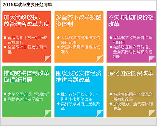 “正如政府工作报告中提出,改革开放是推动发展的制胜法宝。2015年是全面深化改革的关键之年,必须以经济体制改革为重点,在牵动全局的改革上取得新突破,增强发展新动能。”安徽亳州市委书记杨敬农代表说。