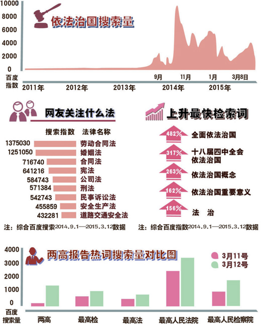 立法法的修改,备受关注:来自百度的统计数据显示,从3月3日到10日,关于“立法法”的百度搜索指数达到15461,日均搜索指数是两会召开前的5倍多。3月13日,“‘两高’工作报告解读”和“立法法”也出现在了百度新闻热搜词里。作为一部“管法的法”,立法法的修改将为全面推进依法治国打牢法律体系基础。