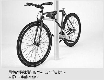 据《华盛顿邮报》日前报道,智利3名大学生发明了号称全球首款“偷不走”的自行车。设计者们把插销锁的概念内置到自行车的整体设计框架中,使三角车架同车座构成了一把锁。人们只需将车停靠于电线杆或大树边,把车座及支撑杆拔出,扣到三角架的锁孔上,便可放心走开。之所以“偷不走”,是因为偷它的唯一方法是破坏这个锁,这也就破坏了整个车架。