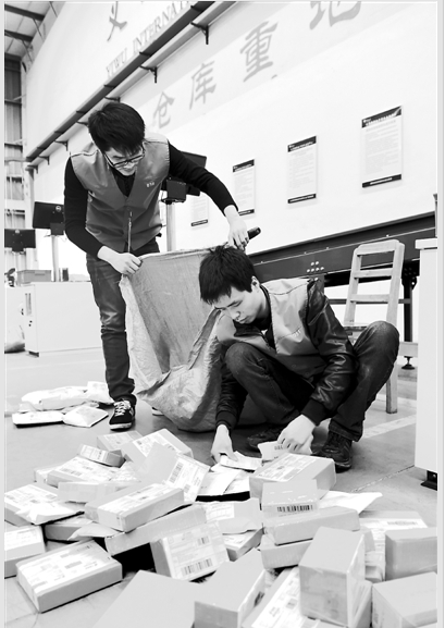 浙江省义乌跨境电子商务监管中心自去年12月26日启动运营以来,目前已经有392家企业在中心备案,货物出口目的地国达到108个。自3月12日开始,义乌跨境电子商务监管中心日均通关量连续破万票,其中在3月19日达到了20141票,迎来跨境电商出口货物最高峰。图为义乌跨境电子商务监管中心人员在分检货物。