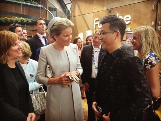 米兰当地时间6月12日,米兰世博会比利时馆迎来了一位尊贵的客人——比利时王后玛蒂尔德。现场,玛蒂尔德王后参观了通灵珠宝在比利时馆展出的“新一代钻石蓝色火焰”及镶嵌了“全火彩”级钻石的新品。她同时接见了通灵珠宝总裁沈东军,并对沈东军获得利奥波德军官勋章表示祝贺。