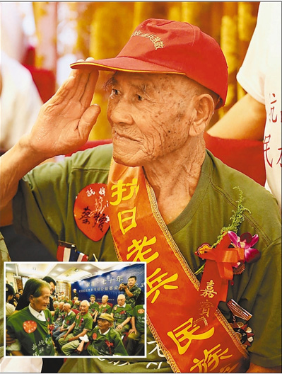 7月5日,江苏省南京市,来自全国各地的30余位抗战老兵聚首南京民间抗战博物馆,参加“聚首·七十年”纪念抗战胜利专项公益基金签约仪式,纪念中国人民抗日战争胜利。他们中既有参加过淞沪会战、南京保卫战、武汉会战、长沙会战、常衡会战的前线将士,也有当年从事辎重、通信、医护等工作的老兵。