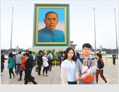 为庆祝“五一”国际劳动节,4月27日,北京天安门广场竖起了巨幅孙中山先生的画像,中外游客纷纷在孙中山先生画像前拍照留念。