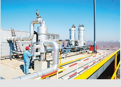 为防止成品油海运装卸中油气散入大气,在上海石化码头投建的油气回收装置日前通过了环保评估并正式投用,成为国内首个投用的码头油气回收装置。该回收装置采用中国自主知识产权技术,通过船岸对接设施,回收装船过程中产生的无组织排放油气,降低排放。图为上海石化码头油气回收装置。