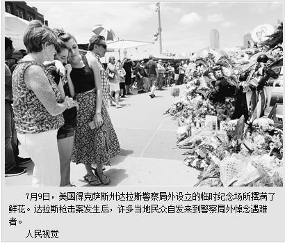 翻看7月10日的主流报纸,《纽约时报》的头版通栏大标题是:美国悲伤、紧张和忧虑;《华盛顿邮报》的头版通栏大标题为:国家因达拉斯枪击案而蹒跚。而《纽约邮报》8日的头版特大字号标题是:内战。