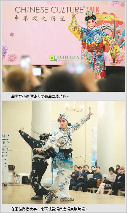 由中国国家京剧院演员袁慧琴担当主讲的“中华文化讲堂”9月11日走进俄罗斯圣彼得堡大学。《三岔口》《游园惊梦》《霸王别姬》《盗御马》《杨门女将》等剧目片段表演,让观众更直观地了解京剧艺术。