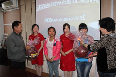 4、学院关工委秘书嵇仁柬与淮城镇路东村委员会书记王金兰共同为特校捐赠体育用品;