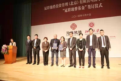 信中写到:冠群驰骋投资管理(北京)有限公司在2014年度慷慨捐资设立“冠群助梦励志奖学金”和“冠群助梦交流基金”,共育英才,共筑宏基。北京大学全体师生敬致谢忱!