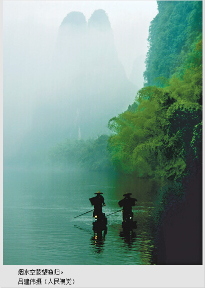 渔村,距集镇约2公里,只通水路。船行漓江上,水环峰转,碧波倒影,山水含情,船在水上走,人在画中游。“江作青罗带,山如碧玉簪”,“分明看见青山顶,船在青峰顶上行”——诗言妙处,只有身到此间,才能真真体味。九马画山、黄布倒影、鲤鱼挂壁……美景无处不有,无时不在。导游说,兴坪耐看,晴时的奇峰倒影,雨时的烟波浩渺,阴天的漫山云雾,各擅胜场,不负游人。