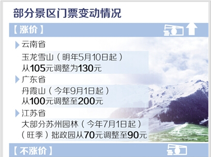 不久前,云南丽江市国家5A级景区玉龙雪山宣布票价从105元调整为130元,但具体执行也要等到明年5月10日。云南省物价局收费管理处负责人范惠声介绍,云南省实行政府指导价管理的景区中,已在今年调价的仅有西双版纳傣族园、大理苍山景区两处,占景区总数的1%。从2012年起,逢春节、“五一”、国庆等法定节日,省内200余家旅游景点还会降价20%。此次国庆,云南省的6家5A级景区,也都不会涨价。