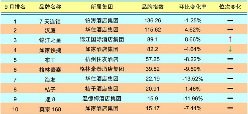 经济型品牌中,城市之家、易佰连锁、99旅馆环比增幅名列前三,分别是49.94%、46.81%、41.01%,海航快捷、都市118、粤海之星列环比降幅前三,分别降幅43.52%、26.33%、18.62%。