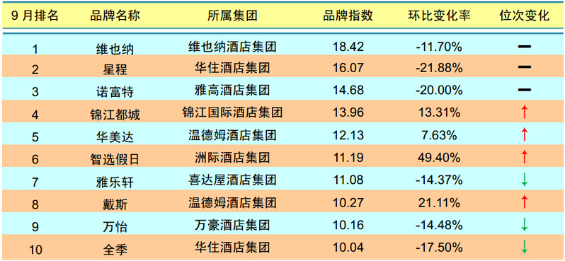 9月迈点旅游研究院共监测酒店品牌159个,其中国际品牌47个,国内品牌31个,经济型品牌31个,中档品牌30个,精品品牌20个,较8月新增3个品牌,分别是中档品牌的五悦和精品品牌的裸心和亚朵。本月监测的品牌中,共有47个品牌品牌指数环比实现增长,占品牌总数的29.56%,也就是说,绝大部分酒店品牌的品牌指数较8月都有所下降。上升的品牌中,其中国际品牌共有12个,占比25.53%;国内品牌7个实现上升,占比22.58%;经济型品牌12个,占比38.71%;中档品牌9个,占比30%;精品品牌7个,占比35%。从占比上来看,9月经济型品牌的上升相对较多,其次是精品品牌和中档品牌。这表明经济型品牌在本月的品牌推广成效比较显著。