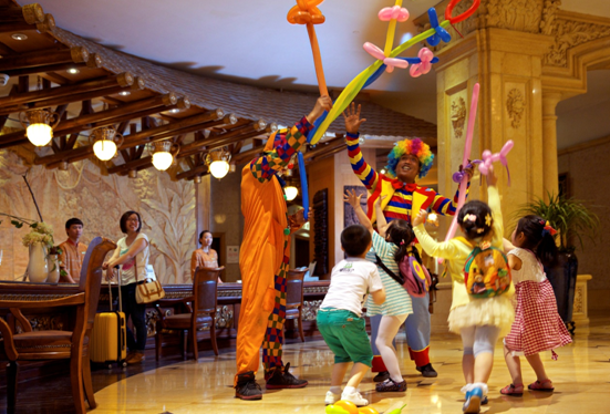 整个酒店像一个城堡一样,每个角落都有浓郁的亲子氛围,泰式迎宾花环、欢乐巡游、卡通互动、亲子主题客房、亲子主题餐厅、宝贝成长俱乐部……酒店房间也充满了家的温馨气息,柔和的壁纸上印满了花朵与可爱的大象,毛巾也叠成萌味十足的小象,适合亲子度假的放松环境让爸爸妈妈们都好评连连。