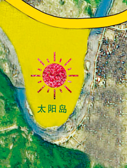 马金溪绕山而过,从山上观景亭看,霞田村的田畈犹如浮在水中的岛屿,以油菜为底,红叶石楠种植成太阳形状,用麦子或者绿色灌木写出“太阳岛”。