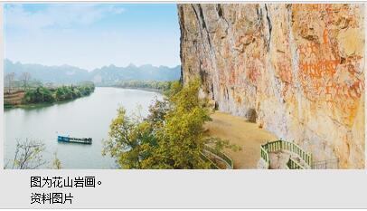 “青山环碧水,岩画面台地”。沿着广西左江及其支流明江一路顺流而下,峰峦叠嶂的青山、碧波荡漾的绿水、平坦开阔的台地,以及灰黄色悬崖绝壁上醒目的赭红色岩画,共同构成了左江花山岩画文化景观。2000多年前,壮族先民骆越人就在这块“世界上最大的岩画画板”上绘制出了诡秘而恢弘的祭祀文明。