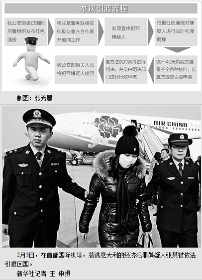 本报北京2月3日电 (张洋、匡逸乔)经中国警方和外交部门通力合作,在意大利警方和执法机构的协作配合下,2月3日,公安部赴境外工作组将外逃意大利长达10年之久的经济犯罪嫌疑人张某依法引渡回国。这是欧洲国家首次批准向我引渡经济犯罪嫌疑人。近期,中国警方还将陆续从有关国家依法引渡回一批外逃犯罪嫌疑人。