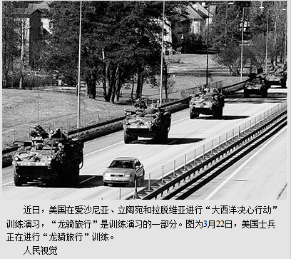 美军参与了“大西洋决心行动”实战演习的多项行动。本月以来,大约3000名驻扎在格鲁吉亚的美国步兵被调遣到东欧,与爱沙尼亚、拉脱维亚和立陶宛三国举行联合军演。根据美国国防部网站的消息,美国与波兰将在3月底举行空中军事演习。美军还将让数辆装甲车辆穿越包括爱沙尼亚、立陶宛、波兰、拉脱维亚、捷克和德国在内的六个欧洲国家,展示盟友间的团结。美国国防部发言人沃伦称“大西洋决心行动”演习旨在让盟友保持信心,展现行动的自由,对北约东部地区可能的“侵略行为”形成“威慑”。