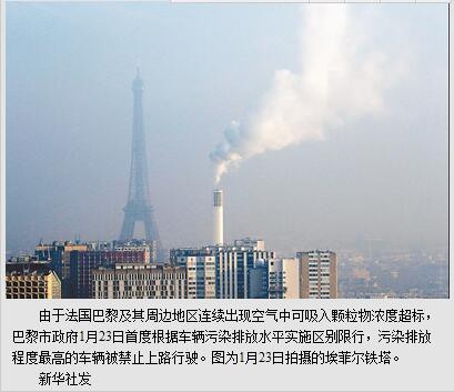 2014年法国巴黎被前所未有的雾霾所笼罩,空气中各项污染物都严重超标。据法国媒体报道,巴黎市政府采取了一些应对措施,但收效甚微,从去年12月到现在,巴黎多次出现重度雾霾天气,重要地标埃菲尔铁塔也是时隐时现,空气污染严重程度为过去10年来最高。据“德国之声”报道,德国一半的电力是火电,由于燃烧大量的煤,该国成为唯一一个突破欧盟设定4条污染物排放红线中3条红线的成员国。