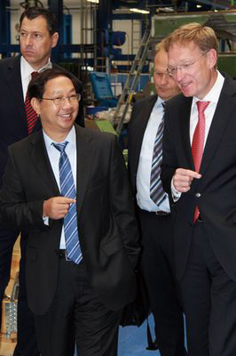 史大使还走访了著名钢铁和有色金属加工设备制造商西马克公司。总经理约阿西姆·舒贝克介绍说,公司已有140多年历史,2012年销售额超过32亿欧元,上个世纪70年代武汉钢厂引进的中国第一套1.7米轧钢设备就是由该公司生产的。目前中国是西马克全球最大市场,占其订单总额21%。史大使积极评价西马克为中国现代化建设做出的杰出贡献,鼓励其将最新技术投入中国市场,协助中国钢铁行业实现节能减排目标和可持续发展。会谈结束后,史大使在舒贝克陪同下参观了轧钢设备生产车间并接受了当地媒体的现场采访。