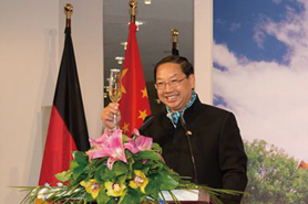 图为中国驻德国大使馆史明德大使在庆祝中华人民共和国成立64周年纪念大会上致辞。