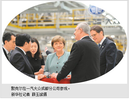 设在成都的“一汽—大众西南基地”,就是成都与德国企业间合作的典范。这个2009年5月份才在成都经开区正式奠基的基地,到今年4月份就实现了100万辆整车下线。7月6日,默克尔在这里专门坐进一辆“新捷达”,感受了“成都制造”的魅力。