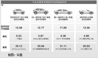 30万—50万元车型合计58款车,配件负担平均指数为17.89,2001广州本田雅阁最低,为5.36,2013北京奔驰GLK级最高,为31.11。
