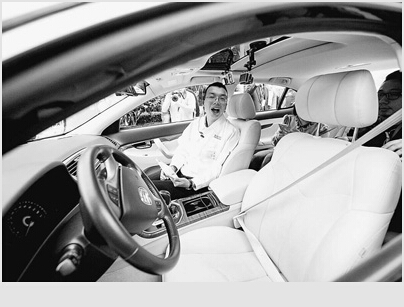 4月12日,在长安汽车2000公里超级无人驾驶出征仪式现场,一名技术人员在向试乘的媒体记者介绍无人驾驶的技术。当日,无人驾驶汽车从重庆出发驶往北京,进行行程长达2000公里的道路测试。