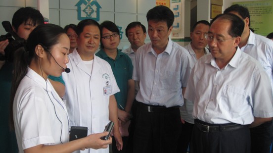 图二 陕西省政府资政郑小明、省卫生厅戴征社厅长在汉滨区新城社区卫生服务中心调研医改卫生工作。