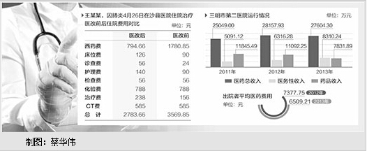 据统计,2011年至2013年,三明22家医院药品收入占比下降11.17%,医务性收入则从2011年的39%提高到2013年的近62%。