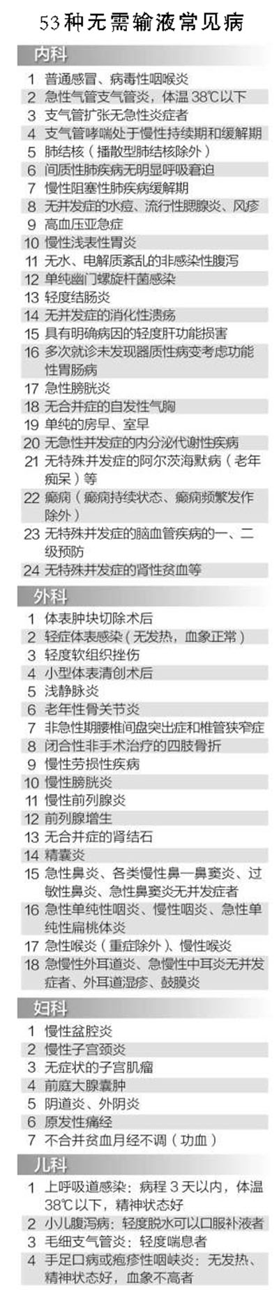 吴振宇:患者病情轻重不同,也有个体差异,是否输液不可一概而论。53种常见病、多发病,虽然不是急危重症,但疾病随时存在动态的演变过程,看似平常的小病也许潜伏着危重症,临床医生应该客观地予以综合判断。也就是说,特殊情况下是可以静脉输液的,只是临床医生应在处方或病历上予以说明。