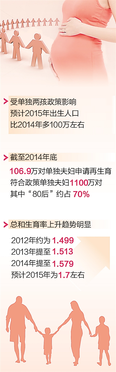 国家卫生计生委计划生育基层指导司司长杨文庄透露,截至2014年底,全国共有106.9万对单独夫妇申请再生育,基本符合预期。预计2015年,受单独二孩政策影响,出生人口比2014年多100万左右。全国符合政策单独夫妇1100万对,其中“80后”约占70%。在我国育龄妇女趋于减少的情况下,出生人口不降反升,这表明单独二孩政策的效果正在显现。