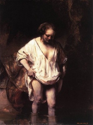 伦勃朗所塑造的女性,从不以性感去诱惑观者,而是用来自女性自身的魅力,即亲切、自然、真实的体态打动观众。这幅入浴的女子像,描绘的是他原来的女仆、后来的妻子亨德里克治。画家从生活小节中描绘女性另外的一面,即天真烂漫的孩子气。这是一幅心情愉快时即兴写生的肖像画,提着连衣裙、蹑手蹑脚地探步下水的亨德里克治,显示出女性特有的娇态,既胆怯,又温柔,富有一种自然天成的美感,这些特质都在她毫无修饰的姿态中和低垂的脸上表现出来。