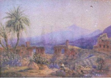 雅各布·苏特 (Jacob SUTER)是著名的北欧画家,十九世纪上半叶时活跃在意大利,是浪漫主义潮流的组成部分。《小镇陶尔迷》描绘了西西里小镇陶尔迷那一座始建于公元前三世纪的希腊剧院,体现了田园式的意大利。画面中,雄伟壮丽的大剧院废墟中,一个牧羊人正和他的羊群在这里稍作休息。剧院已经被印度无花果、棕榈树和许多地中海灌木所侵占,这一点很好地诠释了这幅画的本意,那就是将过去的宏伟与牧羊人进行比较,使这种宏伟越发能够得到彰显。而经典的废墟沉浸在诗意抒情的背景中,恰如其分的迎合了壮游时期意大利许多游客的品味。