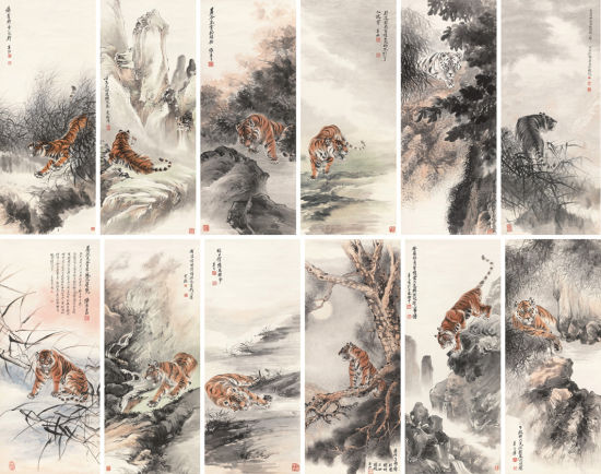 此幅作品为张善孖1928年所作。该画曾有过4次出版。图谱中,十二只老虎或立或卧、或行走或回眸、或静伏或狂啸,形态各异、栩栩如生,画中款识取自《西厢记》中十二句艳词,分别为: