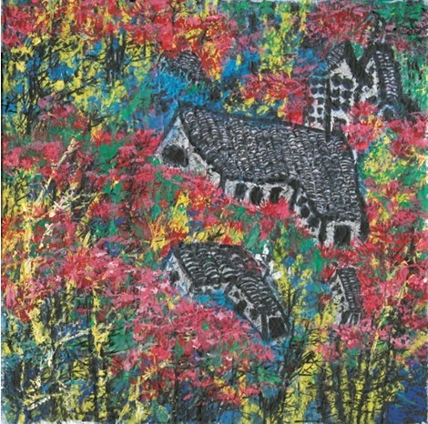 罗小华的这幅《田园》,是一幅返璞归真之作。整幅画作呈现出无比诗意的情景——绿色、黄色、红色交相辉映的树林正在季节的交替中悄悄经历着转变,树木以各自随性的姿态生长着;在彩色的树林中,几间黑瓦白墙的房屋点缀其间,形成了别有一番诗情的画面。整幅画卷的色彩搭配并不是杂乱的混搭,仔细观察就能发现,画面中的色彩是有层次感的组合。这样的安排让观者在强力色彩对比下又能感到一种规律感和节奏感。画面对构图也颇为讲究,几栋小屋的设置不是随意地安放,而是遵循黄金分割比例,所以在视觉上几栋小屋没有强了田园的风头,但又不乏情趣。在技法的运用上罗小华大胆的将中国画的笔法和油画的用色结合,这样的结合创造出了这幅极富观赏性和视觉冲击力的画卷。