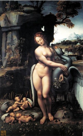《丽达与天鹅》的题材取自于希腊的神话故事,斯巴达国王廷达瑞俄斯被兄弟希波科翁驱逐出国,他到了希腊中部的埃托利亚被国王收留,并且国王把女儿丽达嫁给了他。廷达瑞俄斯娶了丽达之后,竟然得意忘形,忘了向阿佛洛狄忒祭祀,于是遭到了阿佛洛狄忒的报复。廷达瑞俄斯将丽达安排在一个十分幽雅恬静的小岛上,几乎与世隔绝,一天,丽达正在湖中沐浴,阿佛洛狄忒就让宙斯化为天鹅,自己变成鹰,苦苦追逐宙斯这只天鹅。天鹅宙斯被阿佛洛狄忒追到湖边,盘旋于湖上,恍惚之中看到美丽的丽达,顿生爱慕之情,翩然落到丽达身旁,丽达看它健硕可爱,把它搂抱怀中爱抚不停,谁知,这是阿佛洛狄忒的精心策划,丽达受孕,生下四只蛋蛋,孵出四位天使般的儿女。达.芬奇的这幅画的画面草地上那四个破壳躺在地上仰视母亲的小孩,就是那四个蛋蛋。在这幅画中,丽达体态丰腴,面带微笑,背景是一座深色古代废墟,衬托出丽达洁白无瑕的玉体,所要表达的主题是生命繁衍蕴含人类生育的意象与价值。