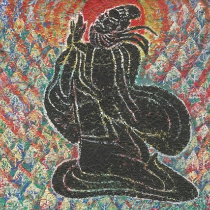 罗小华的这幅《把酒问青天》,灵感来自唐代诗人李白的著名诗篇《月下独酌》,整幅作品秉承东方审美传统和文化心性,又融合了西方色彩,是多种绘画风格和谐相融的佳作。粗看这幅作品,背景好似法国映像派的风格,和《孔子学说》的表现手法相似,以强力对比的色块让观者有视觉的冲击。再看李白,鲜艳的衣着用油画的技法表现,这样的技法在以往的中国古代绘画中难得一见。背景以蓝色为底,黑色线条随意勾勒,周身被黄与红两种色点围绕,貌似在表达诗人的思绪,看似杂乱,但富于变化和节奏,暗含了诗人丰富多彩的内心世界。为了突出李白的形象,罗小华将李白周身仿佛披上了月光的白,整个人物有了浮雕般的立体形象,更显飘逸灵动,体现中国哲学所特有的天人合一,虚静忘我的精神境界。