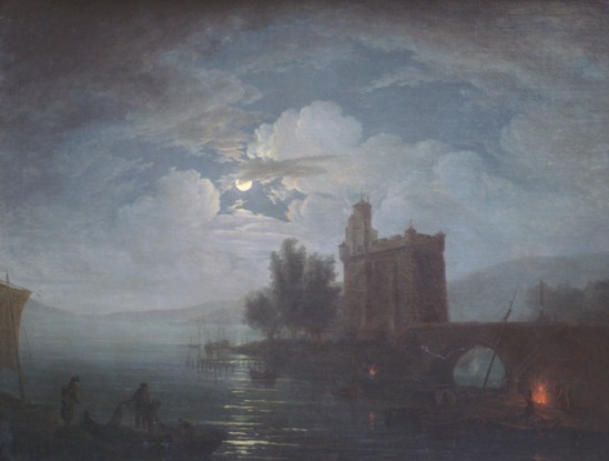 “水面夜景(Night view on water)”就是出自18世纪的法国画院的画作。这幅画是在壮游期间完成的,当时那些外国画家,尤其是法国人,来到意大利来欣赏庞贝城刚刚被发掘的古罗马废墟。月光照耀下的湖面景色,湖边伫立着的单层城堡,这些都证明了作者想要通过这不寻常的一幅画来传达给观者的浪漫主义情怀和诗句。