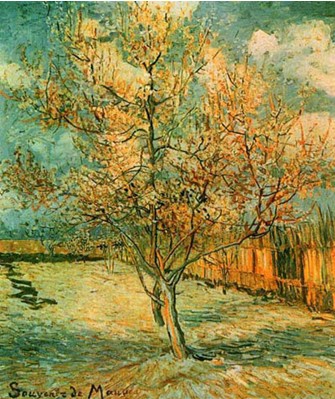 对于生存的真谛,伟大的画家梵高最能体会。梵高生性善良,同情穷人,早年为了“抚慰世上一切不幸的人”,他曾自费到一个矿区里去当过教士,跟矿工一样吃最差的伙食,一起睡在地板上。矿坑爆炸时,他曾冒死救出一个重伤的矿工。他的这种过分认真的牺牲精神引起了教会的不安,终于把他撤了职,这样,他才又回到绘画事业上。梵高全部杰出的、富有独创性的作品,都是在他生命最后的六年中完成的。他最初的作品,情调常是低沉的,可是后来,他大量的作品即一变低沉而为响亮和明朗,好象要用欢快的歌声来慰藉人世的苦难,以表达他强烈的理想和希望。他的画面上不单充满了阳光下的鲜艳色彩,而且不止一次地去描绘令人逼视的太阳本身。为了纪念他去世的表兄莫夫,他画了一幅阳光下《盛开的桃花》,并题写诗句说:“只要活人还活着,死去的人总还是活着。”
