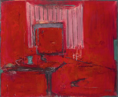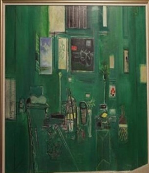 系列作品之一《绿色空间》,深绿色主色调,悠远而宁静。屋内静物轮廓硬朗,突显其立体派追求几何形体美及排列组合美的理念。整幅画充分发挥线条、形体、色彩、明暗调子等因素的综合表现力,将画家眼中的世界呈现在我们的面前。