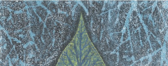 除此之外,对主题静物的刻画角度选取也很有特点,只画出叶子的角以为观者留下想象的空间,同时也是一种突出刻画的表达手法——去繁就简的风格特点。在冷色为主的画面中,一抹淡绿显得那么脆弱,让人怜惜。但在画家笔下,强烈清晰的蓝色叶脉寓意着艺术生命的顽强不屈和冷静坚强。明暗强弱,反差的对比是这幅作品凸显出主题的手法。只有细细品味画面的细节和整体才能体会画家所表达之意,正是这幅佳作耐人揣摩之处。