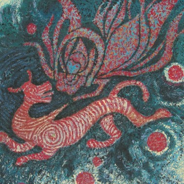 用东方的神话结合西方的绘画技法,常常是罗小华风格的作品。《飞天和麒麟》就是其中一幅比较有代表性的作品。“飞天”多在佛教壁画中出现,敦煌石窟壁画的“飞天”可谓世界闻名。罗小华在早年对敦煌壁画有所研究,所以钟情于这个主题也不为奇。“飞天”既指飞舞的天人,也就是神仙。画中所描绘得飞天是歌神乾闼婆,为古印度神话中的歌舞之神,后被佛教收为天龙八部众神之内。也有传言说乾闼婆是胎儿的守护之神,在新生命诞生之时,保护胎儿不受鬼神侵扰。画中下方的麒麟也是被人熟知的神兽,在中国传统神话中,麒麟是送子的象征,表达了古人对生育的崇拜。飞天与麒麟同有象征新生之意,没有对中国文化的深刻理解,是很难懂得画中的含义。