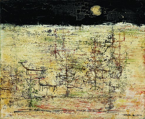 《有月亮的风景》是赵无极作于50年代早期的作品,他汲取充满幻想玄妙氛围的点与线描绘景色,将晕黄色的月在深沉的黑昼映照着斑驳的黄土地,如甲骨文裂缝般的细劲线条,形象出鹿与书的简洁造型,充满着对亘古文化源远流长的崇敬。赵无极在1948年春离开祖国,到法国巴黎开始艺术生涯的新旅程。为了寻找新的艺术天地,发展新的艺术形式与技巧,他在巴黎如饥似渴地流连于世界名作之前,广泛接触各种新的艺术流派。由于他非凡的才智和努力,很快就找到了自己的艺术方向。他勇于探索,把中国传统的艺术精神融和到现代艺术中去,形成了独特的艺术风格,引起了巴黎画坛的注意和肯定。