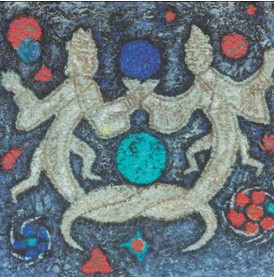 宗教艺术作品是罗小华敦化艺术创作中的代表,在她把佛教文化题材融进的艺术中可以看到她对敦煌宗教艺术的通透理解。在她的作品《两主神》中,罗小华融汇了中原艺术和希腊艺术的审美形式,用笔触体现中国人的生活激情。中国人善于把佛的符号还原成世俗的符号,把世俗的符号创造为艺术的符号,并在这种不断转换的过程中体验生命的形而上意义的艺术,罗小华正是基于传统中国人的思想基础上,借助伟大的想象力,构造出生命寻求终极依托的天国境界的艺术,而这样的艺术正是能置于21世纪审美视觉中,并透视历史内涵和当代意义,建立起研究及其美学话语的艺术。
