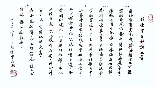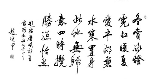 赵连甲,1947年出生,北京人,当代实力派书法家。1982年毕业于首都师范大学。曾任北京天寿山书画院院长,现为中国建设书法家协会会员,北京中国书法研究社成员,北京中山书画院成员,中国国家博物馆画廊艺术委员。2012年以后,相继受聘中国人民解放军三军仪仗队文化顾问,解放军国防大学文化艺术中心顾问,中国国际商会文化产业委员会顾问。